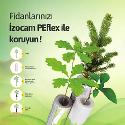İzocam PEflex Fidan Koruyucu genç fidanları korumak için tasarlandı. Fidanın gelişiminde çok önemli olan ilk yılında zararlı ot ilaçlarının fidana ulaşmasını önleyen bu ürün, fidanı dikim sonrası yaşanan geç donlardan da koruyor.
