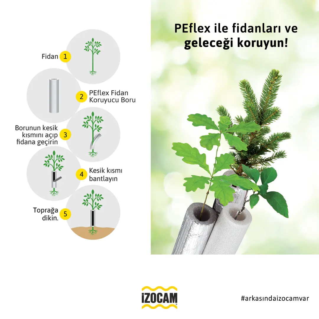 Genç fidanları korumak için tasarlanan İzocam PEflex Fidan Koruyucu doğa dostu PE malzemeden yapılıyor ve fidanın gelişiminde çok önemli olan ilk yılında zararlı ot ilaçlarının fidana ulaşmasını önlüyor, fidanı dikim sonrası yaşanan geç donlardan koruyor.