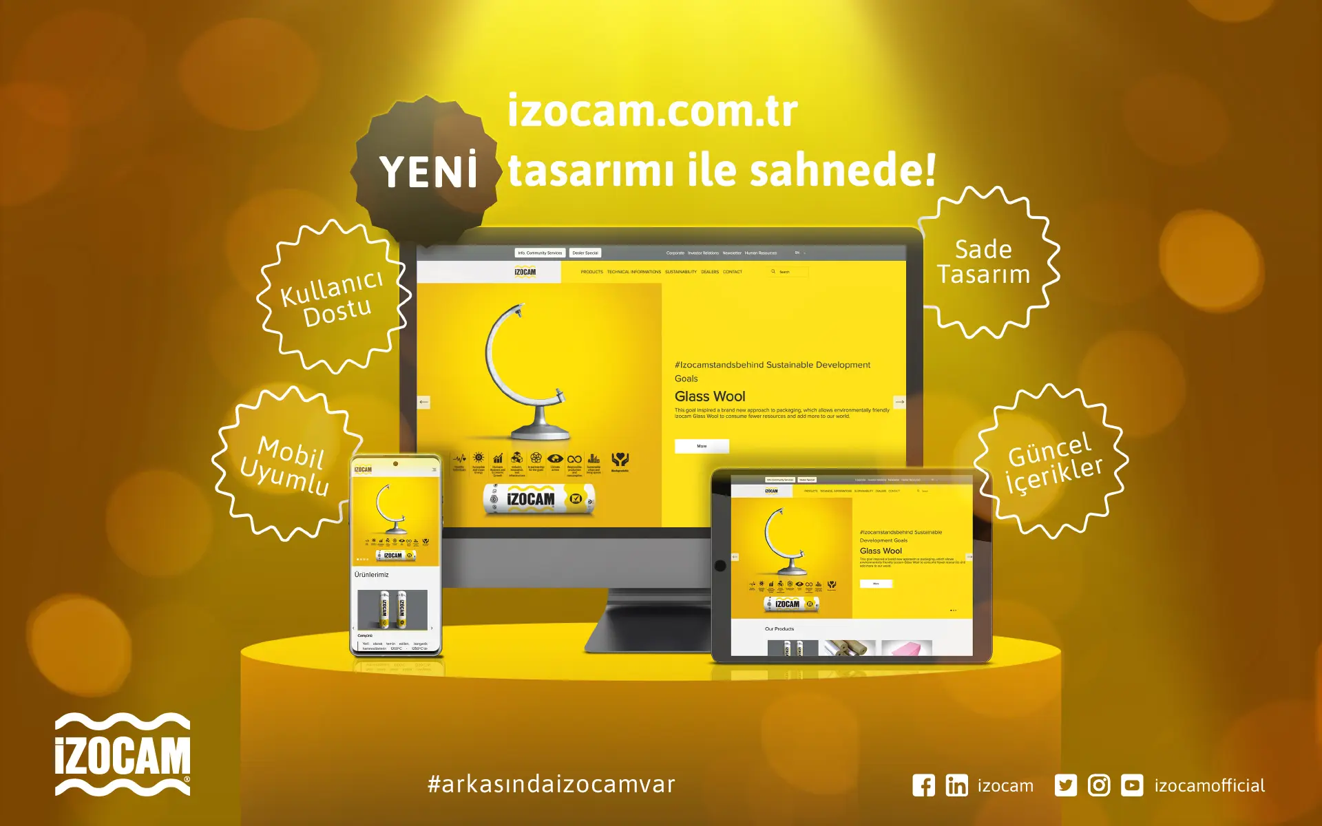 İzocam’ın yaptığı her işin ve arz ettiği her ürünün arkasında olduğu mesajını taşıyan “Arkasında İzocam var” mottosu ile uyumlu söylem ve görsellerin kullanıldığı yeni web sitesinde; sürdürülebilirlik menüsünden bugüne kadar arkasında olduğumuz referans projelere kadar pek çok yeni içerik eklendi.