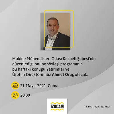 Her ayın 3. Cuma günü yapılması planlanan Mühendislik Söyleşileri`nin ilk oturumu Yatırımlar ve Üretim Direktörümüz, Makina Mühendisi Ahmet ORUÇ`un katılımı ile 21 Mayıs 2021 20:00`da çevrimiçi olarak gerçekleştirildi.
