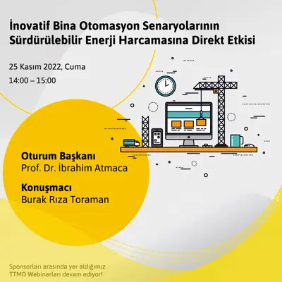 Üyesi olduğumuz Türk Tesisat Mühendisleri Derneği webinarları (TTMD), 2022 Kasım ayında da devam etti. İzocam olarak, destekleyicileri arasında yer aldığımız ve 25 Kasım 2022 Cuma günü saat 14:00-15:00 arasında gerçekleştirilen webinarın bu ayki son seansının konusu “İnovatif Bina Otomasyon Senaryolarının Sürdürülebilir Enerji Harcamasına Direkt Etkisi”oldu.