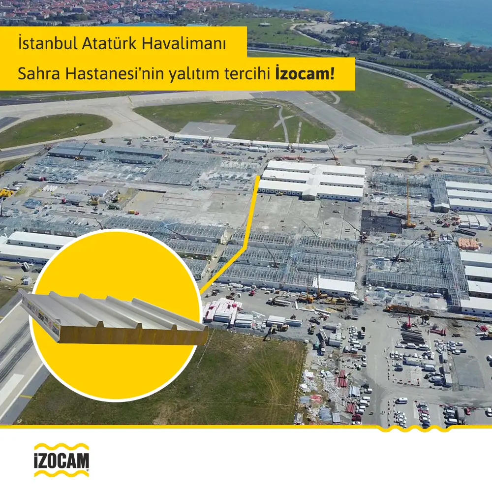 Halen inşaatı devam etmekte olan İstanbul Atatürk Havalimanı Sahra Hastanesinde İzocam Bayisi Arken Yapı Mimarlığın temin ettiği, eğimi %10’dan yüksek çatılarda yüksek yangın dayanımı, ısı, ses ve su yalıtımı için üretilmiş her iki yüzü çelik sac kaplı, mineral yün yalıtımlı İzocam Tekiz Taşyünü Çatı Panelleri kullanılıyor.